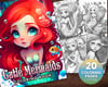 20 Cutie Mermaids Underwater Princess Coloring Book, Adults + kids- Instant Download Grayscale Coloring Page - Printable PDF, ocean life