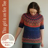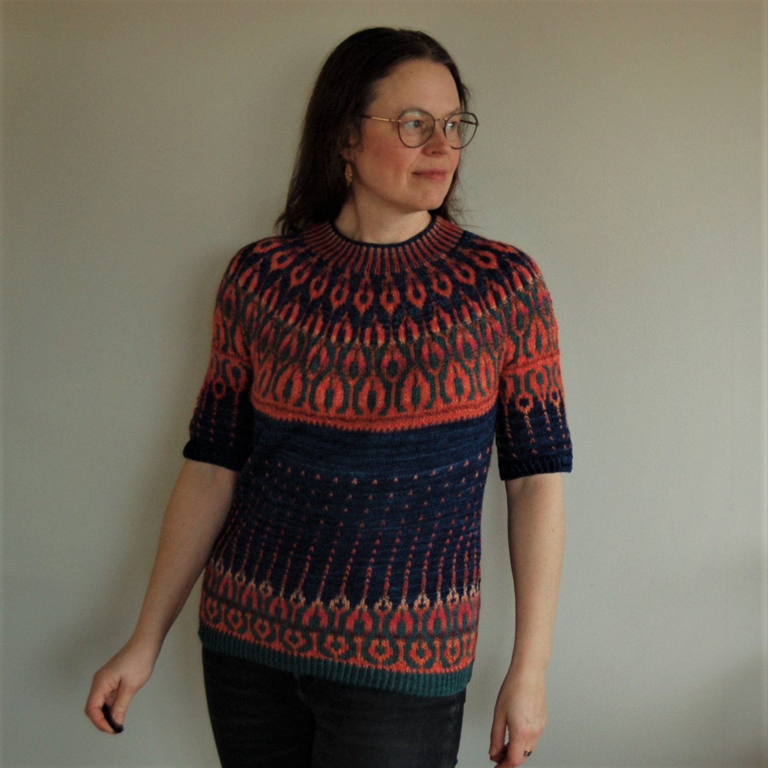This is a top-down yoked tee/sweater, most of it worked in stranded colorwork. It starts at the collar with corrugated ribbing, then some short-rows for neck shaping and then the full yoke. After sleeve separation the body is worked mostly in stranded colorwork and then finished by twisted rib. Sleeves are short (to the elbow) and they are also finished by twisted rib.