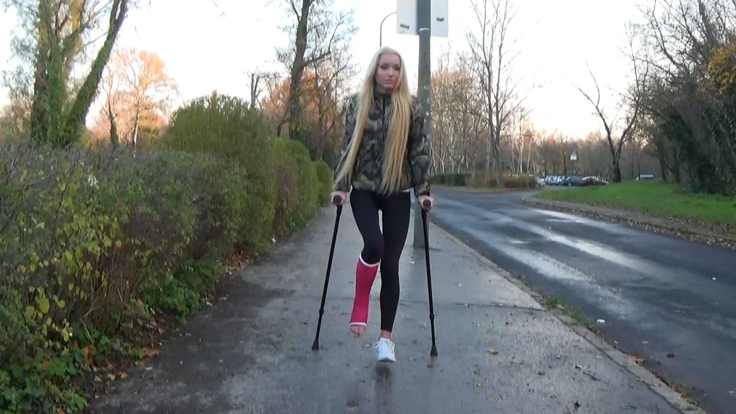 Britney crutch from the car along the road with her red short leg cast.Even if it late in November she dont have a sock on her casted leg so we can see her toes with a red nailpolish on.This is a great crutching clip with Britney