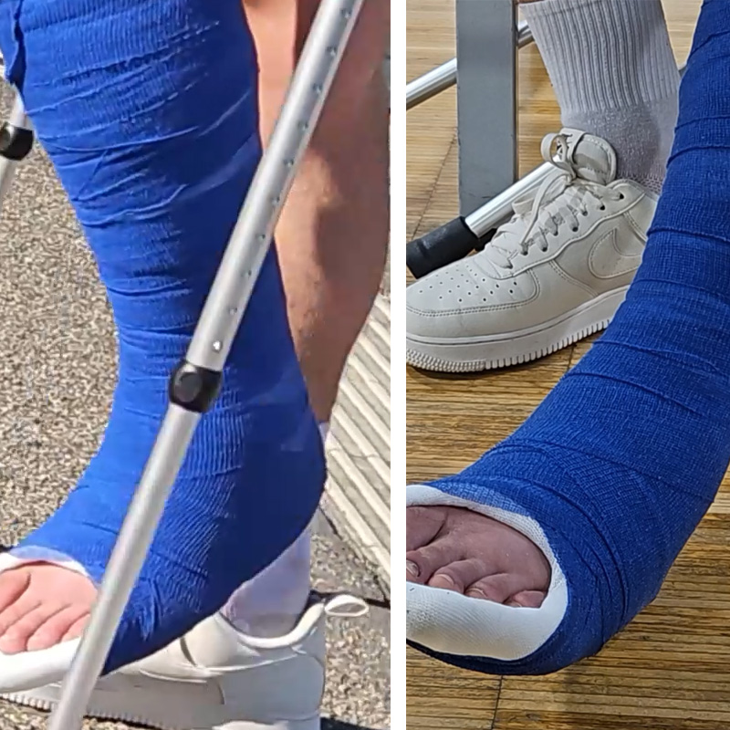 His cast is an SLC splint made of fiberglass, which was fixed with a blue bandage. His very large toes rest on a toe plate that is much longer than his toes.