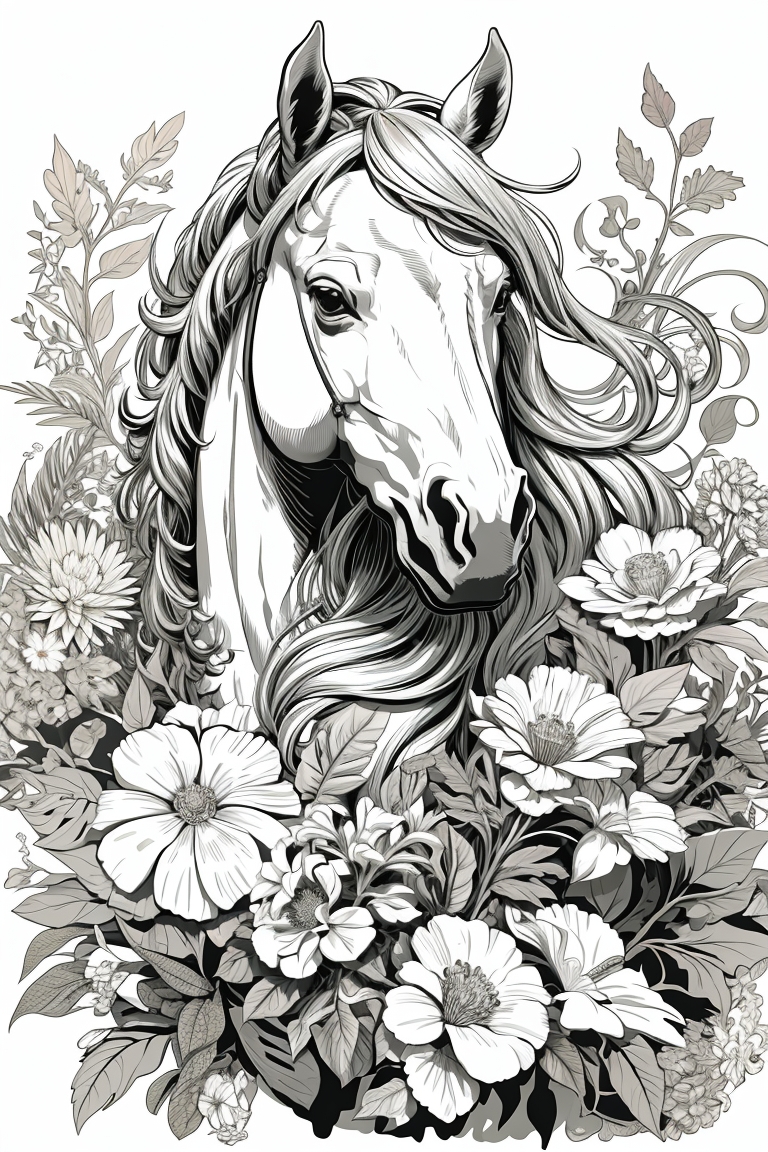 Here's the detailed vector illustration of a horse surrounded by intricate floral patterns, perfect for a coloring book. Let me know if you'd like any modifications or additional designs