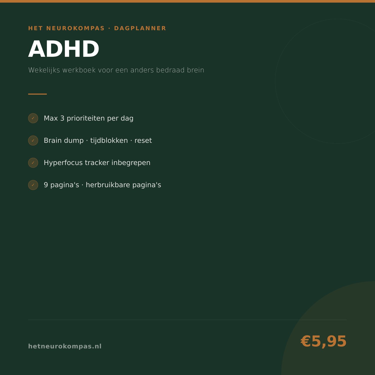 Deze dagplanner werkt mét tijdblindheid in plaats van ertegen. Maximaal 3 prioriteiten per dag. Ingebouwde resetmomenten. Energie vóór taken.