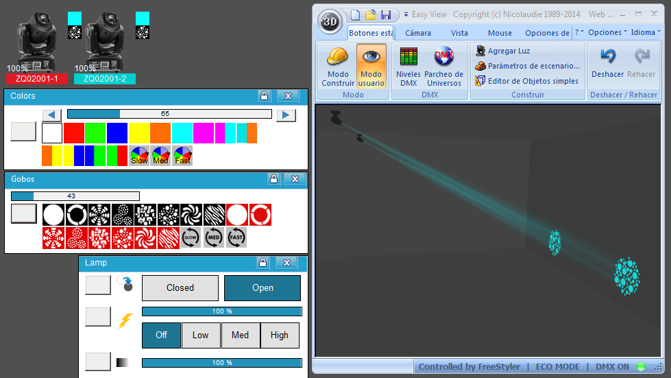 - Esta librería no reemplaza al Fixture de Freestyler o QLC+, sino que es un complemento para ver las secuencias en 3D. Es decir, HAY QUE TENER YA EL FIXTURE DE FREESTYLER o de QLC+ para este equipo.