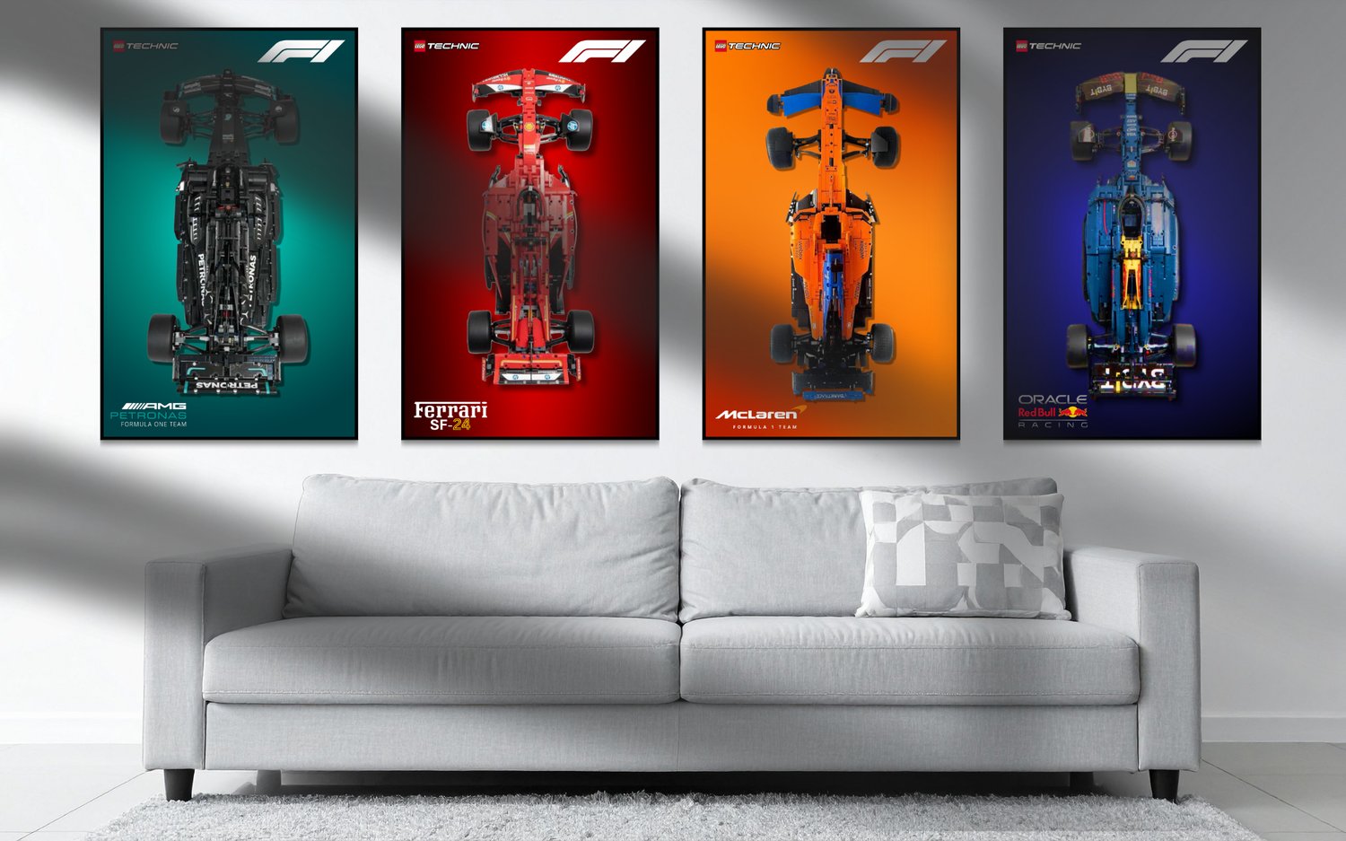 This Oracle Red Bull Racing RB20 framed poster (50×80 cm) is a bold and cinematic wall display created to complement the LEGO® Technic F1 Oracle Red Bull Racing RB20 (#42206).