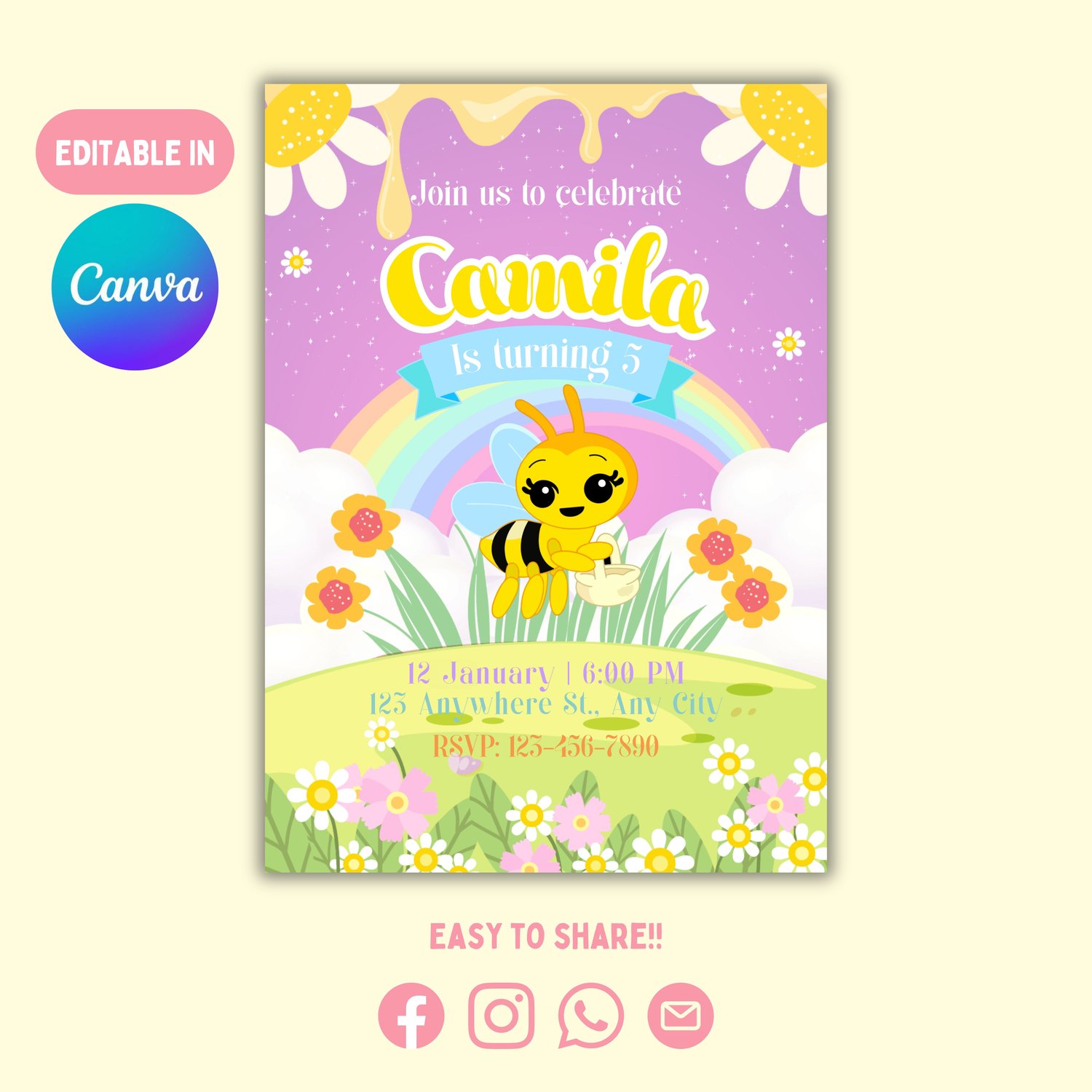 Invitación de Cumpleaños Editable Abejita Chiquitita Lila (Canva)