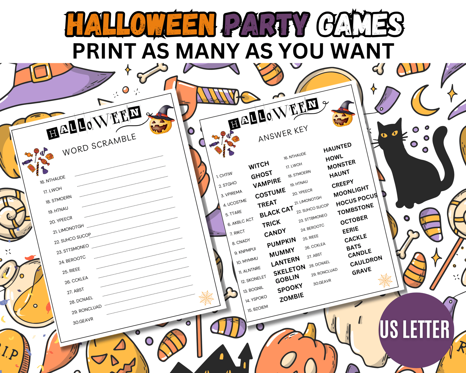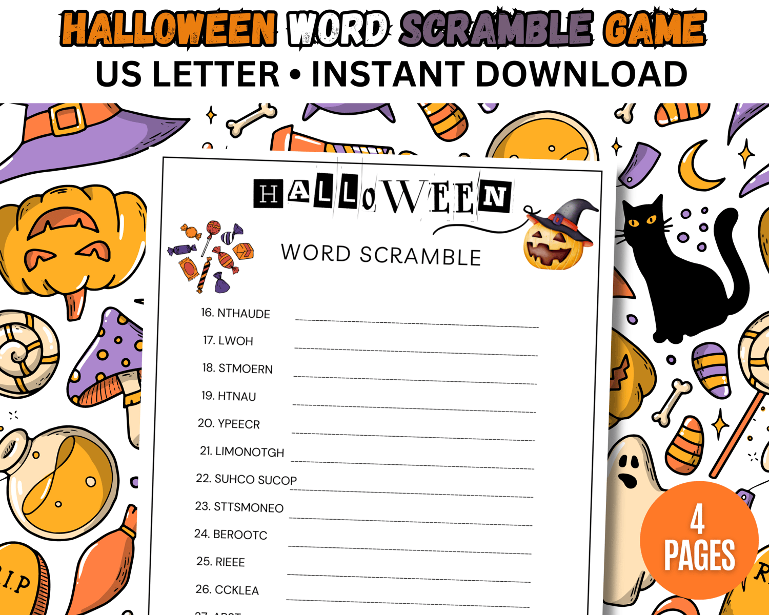 Halloween Word Scramble Game, Activity Sheet for Kids, Teens, Adults, Office