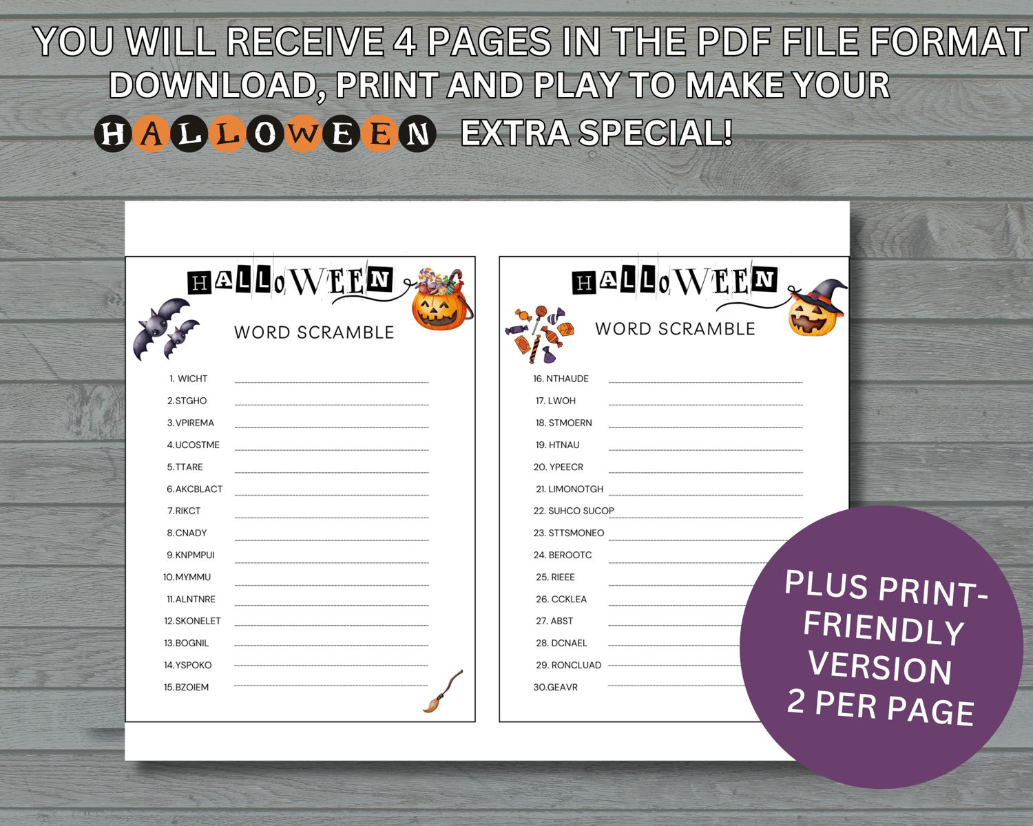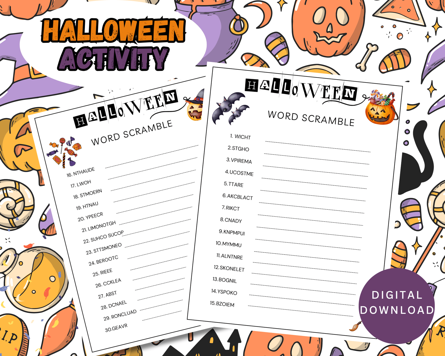 This Fun Halloween Word Scramble Activity with 30 questions and answers is the perfect Halloween Game to make your spooktacular holiday extra special!