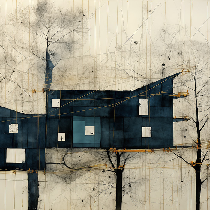 A striking dark-blue house rises among bare trees, its form stitched with golden thread-like lines. Threadline House is both architectural and dreamlike — a study in structure, nature, and quiet imagination.
