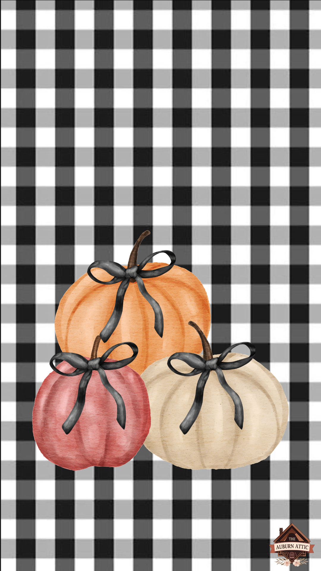 Add a touch of cozy charm to your device with this stylish wallpaper and lock screen! Featuring a classic black and white buffalo check background, this design is the perfect blend of rustic and modern. At the center, a delightful trio of pumpkins in varying shades creates a warm, autumnal vibeāeach pumpkin unique, yet perfectly coordinated. Topping off the look is a beautiful black bow, adding a hint of elegance and whimsy.