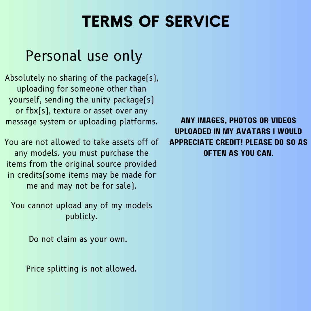 -Absolutely no sharing of the package(s), uploading for someone other than yourself, sending the unity package(s) or fbx(s), texture or asset over any message system or uploading platforms.