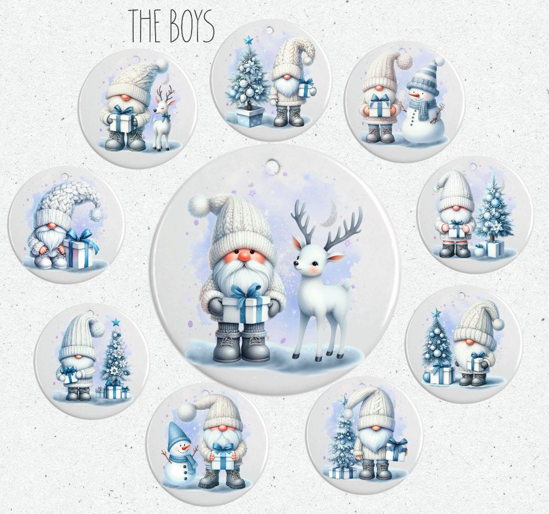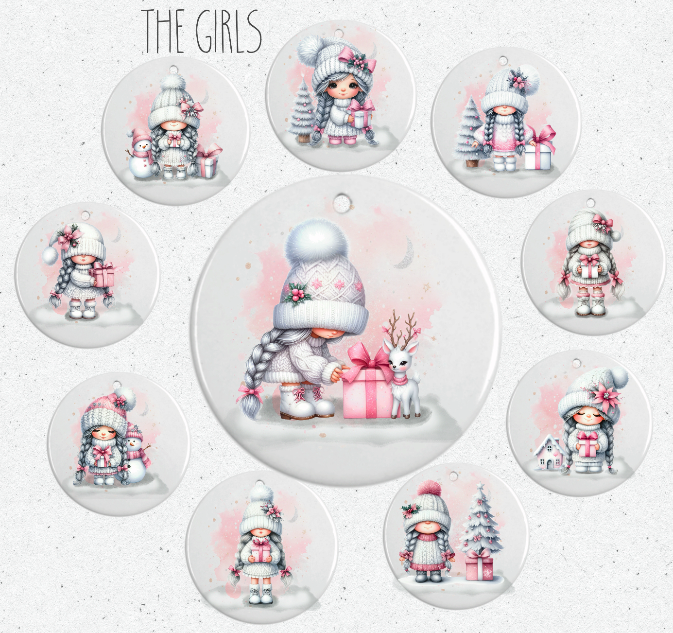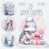 20 White Christmas gnomes. Whimsical designs; 10 boys & 10 girls. Ideal cards, baubles, ornaments, clothing, cushions. Sublimation, print.