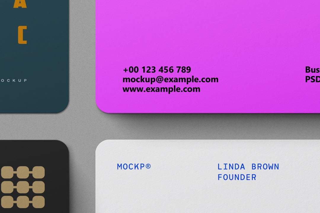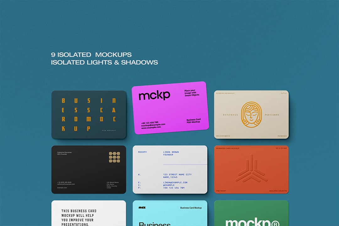 Photorealistic business card mockup pack featuring 9 isolated objects with rounded corners, based on the 85x55 mm format, editable Smart Objects and independent lights & shadows — 5000 × 3500 px at 300 DPI.