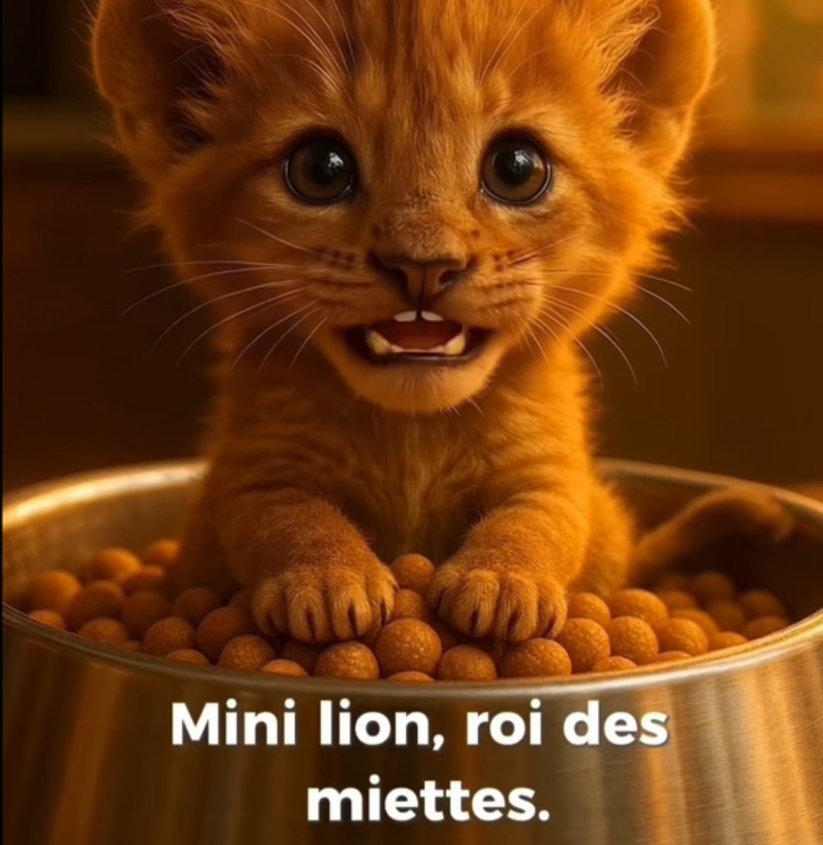 Une scène hyper-mignonne mais totalement ironique : un mini lion dans son bol de croquettes, filmé comme la mascotte suprême du chaos alimentaire.