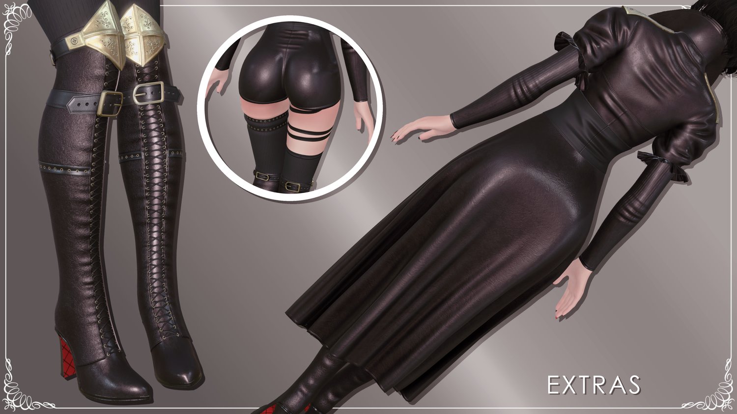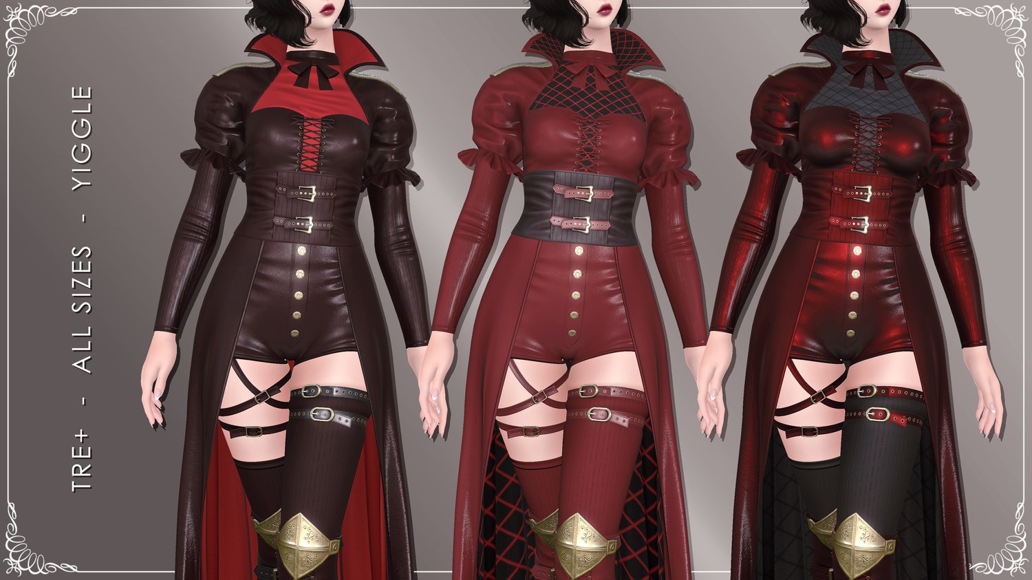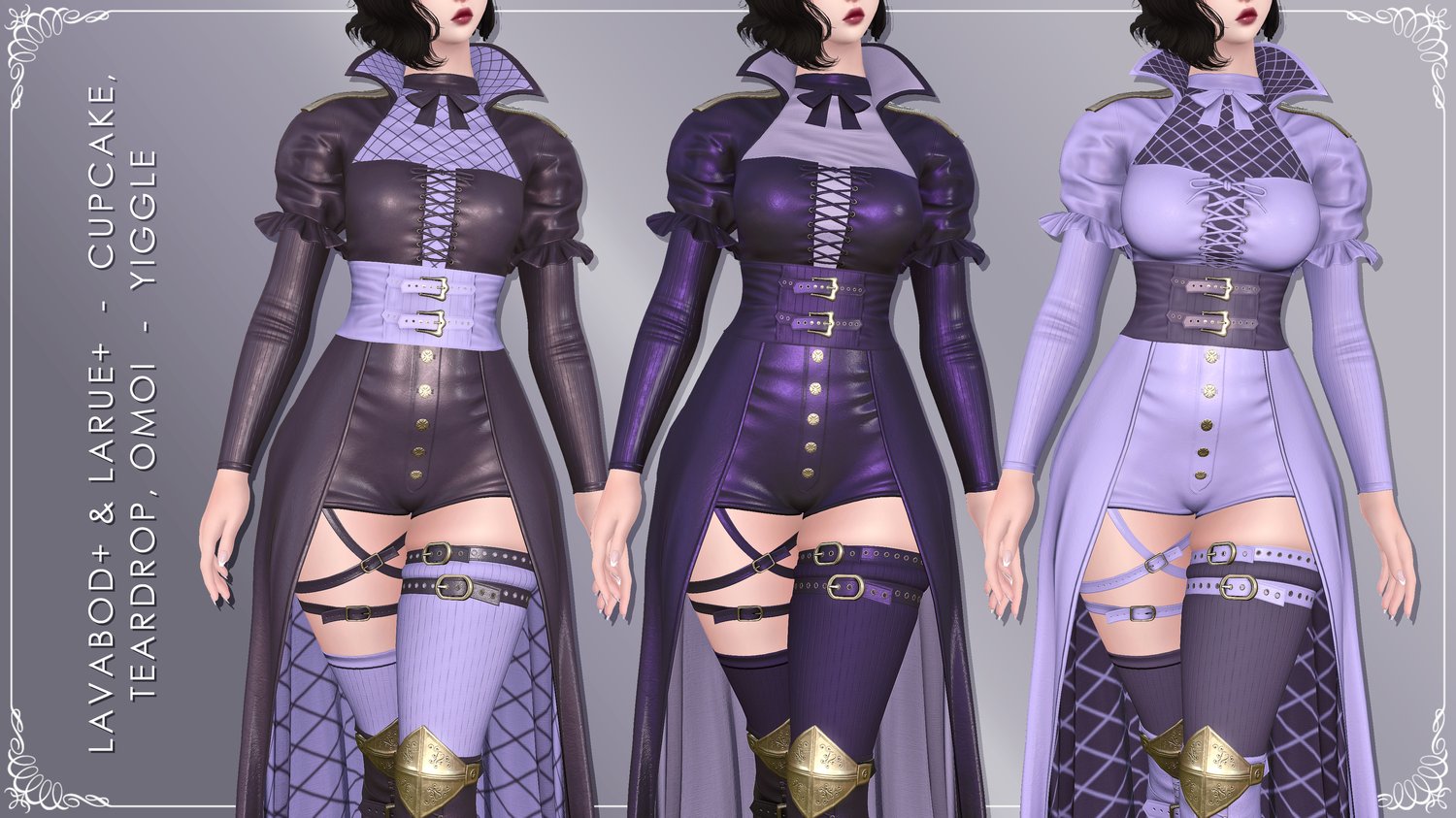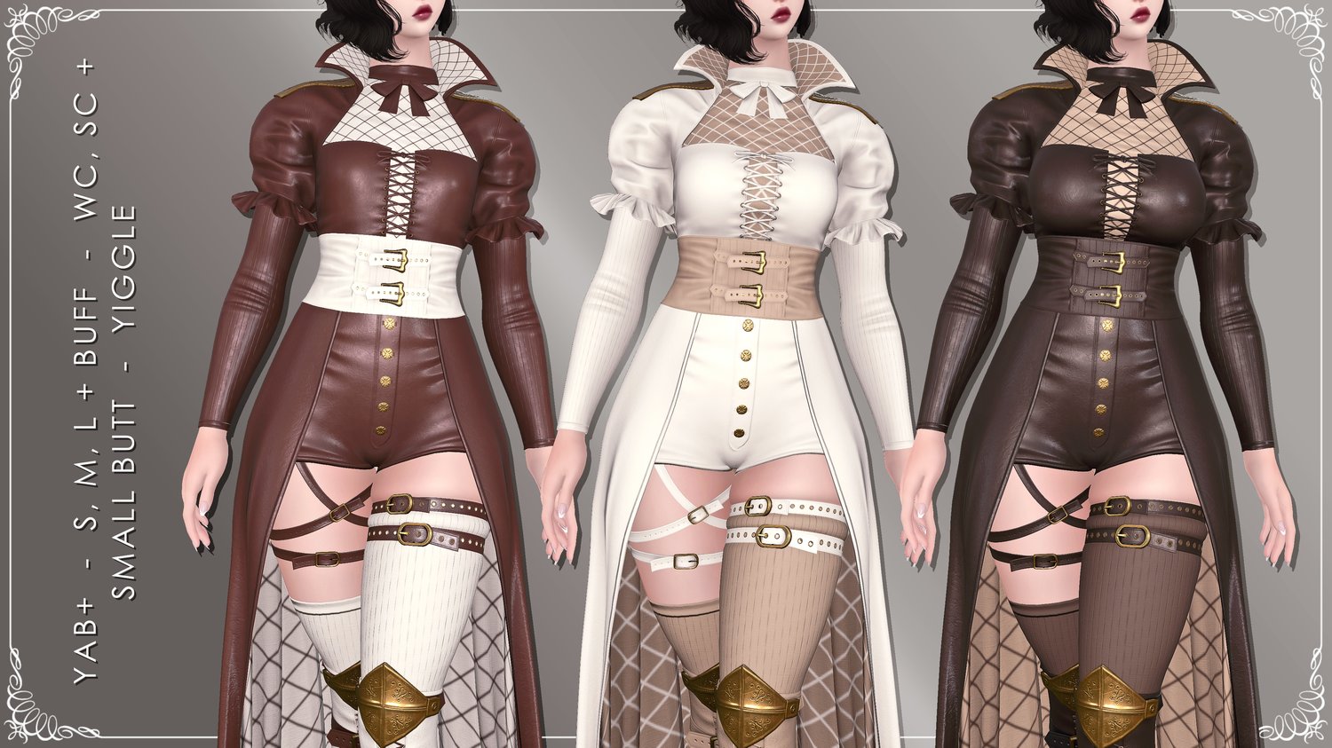 A three-piece leather fantasy set consisting of a corsetted lace-up top with a dramatic high collar and a buttcape, button-up leather shorts with straps and stockings, and lace-up mid-length heels with armor kneepads.