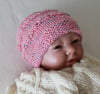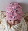 This 8ply/DK Beanie is worked in an easy eyelet stitch and has a garter stitch brim. The pattern includes three prem sizes and a newborn size. The photos show the newborn size.
