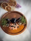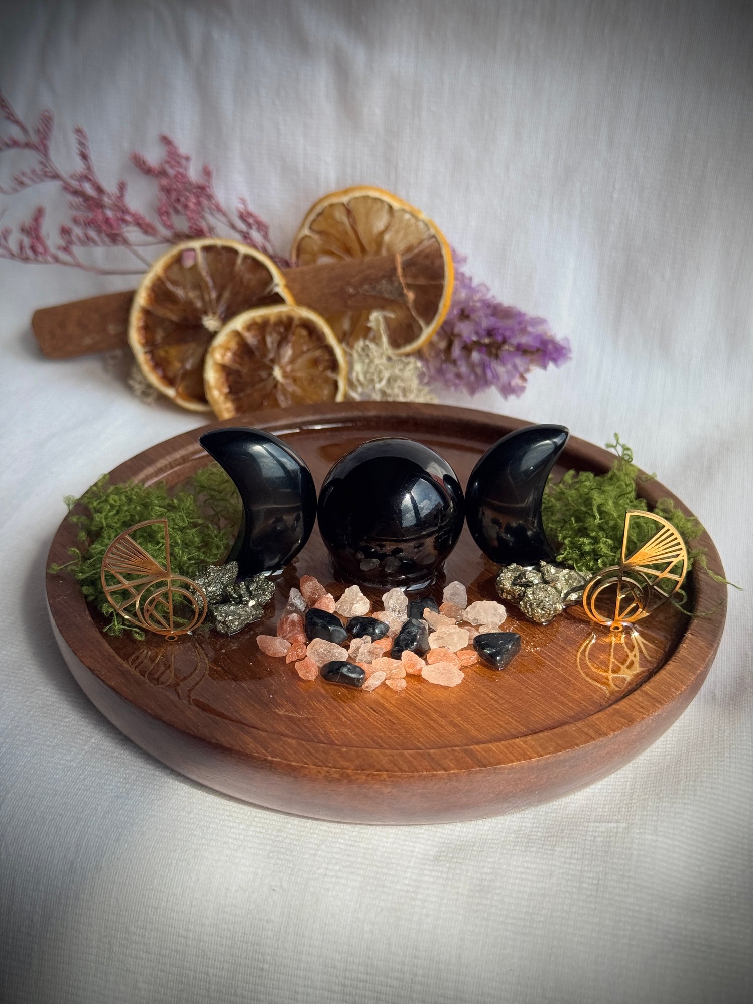 Tento oltář nese energii hluboké ochrany a vědomého záměru. Hlavní roli hraje symbol Trojité Bohyně z černého obsidiánu – uprostřed koule, po stranách srpky, které reprezentují mocné fáze ženského cyklu, lunární sílu a spirituální vhled.