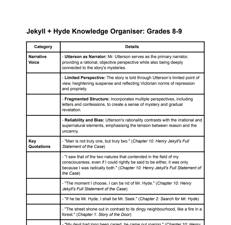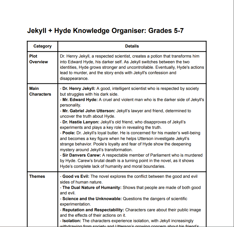 Jekyll + Hyde: Knowledge Organisers (Grades 5-7 + 8-9)