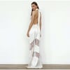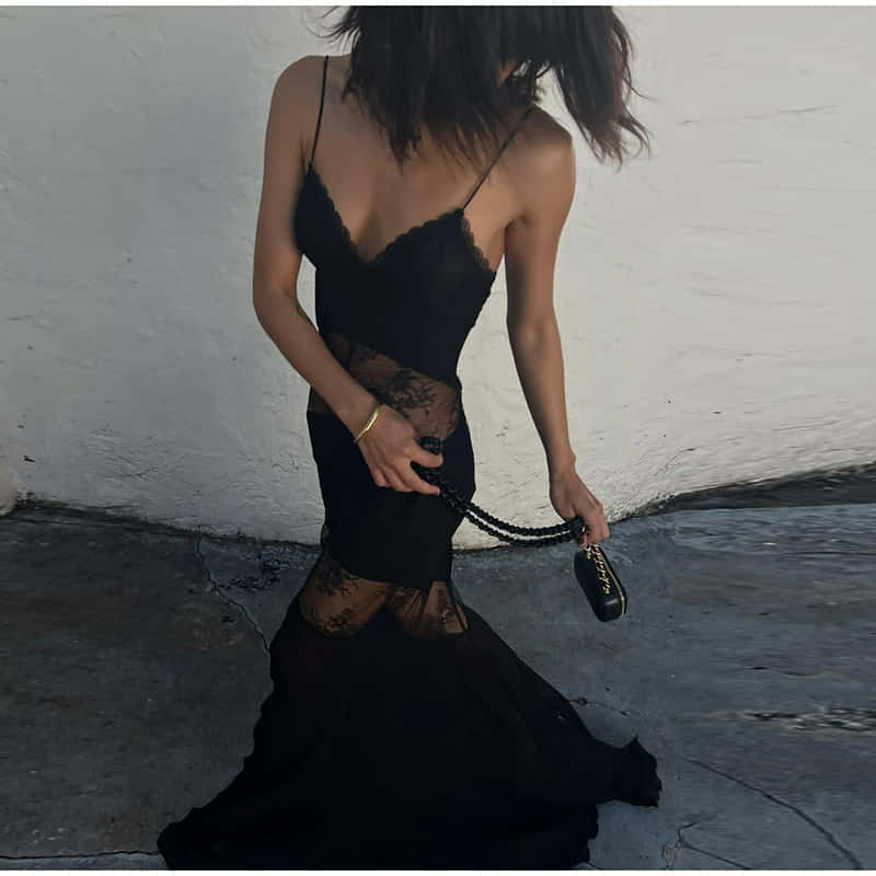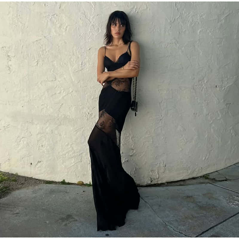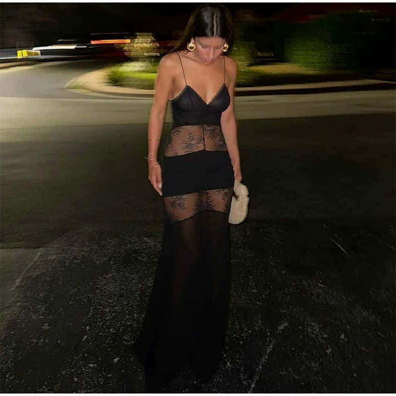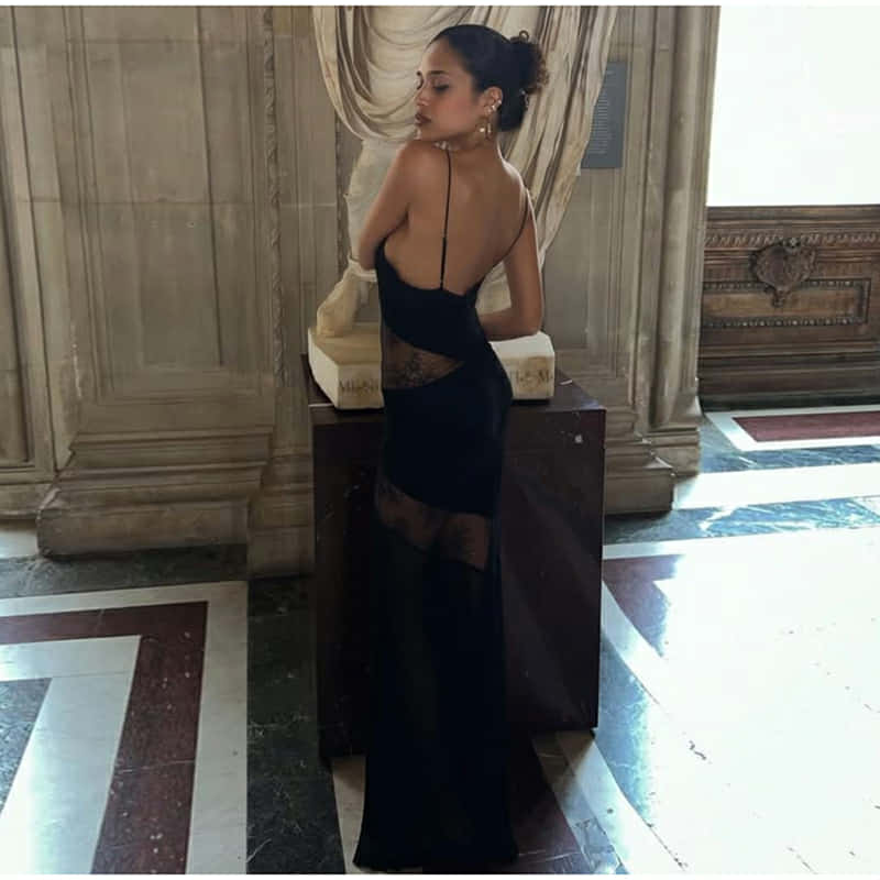 La Skyline Noir Gown es una oda a las noches que transforman. Un vestido negro, etéreo y minimalista, con encaje see-through y espalda completamente descubierta, creado para mujeres que no caminan — flotan.