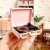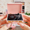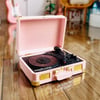 This miniature record player features a moving tonearm and control knobs; the turntable can be removed and the case can be used as a little briefcase!