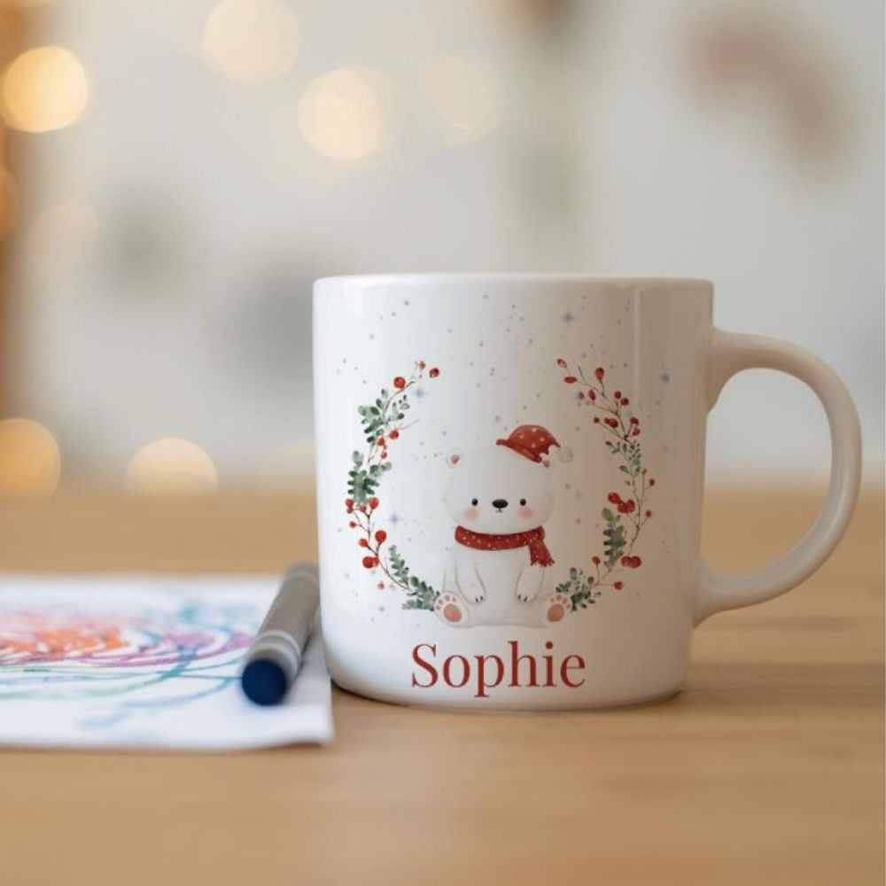 Нашата коледна чаша с венец и мече е създадена, за да носи усмивки и празнична магия в семейните сутрини.