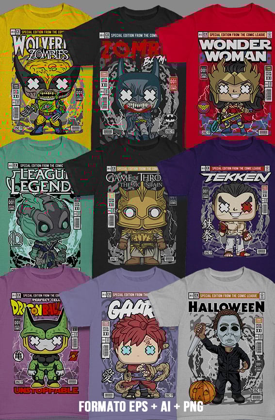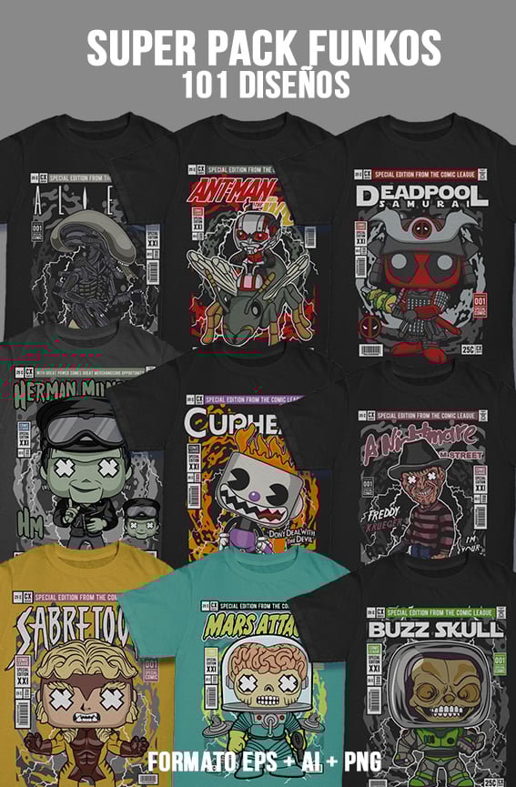 Este pack es un sueño hecho realidad para los fanáticos y diseñadores de productos personalizados. 101 diseños únicos de Funkos en formatos EPS + AI y PNG, listos para llevar tu creatividad al siguiente nivel. Desde personajes de películas, series, cómics y más, tendrás acceso a una impresionante variedad que te permitirá crear y personalizar tus propios Funkos o productos relacionados.