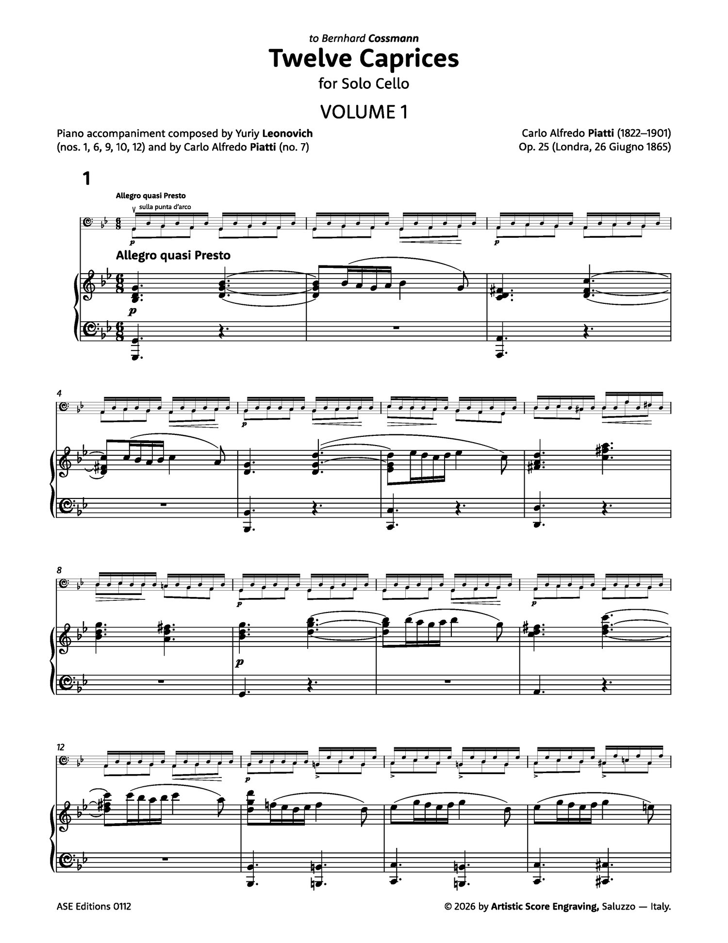Carlo Alfredo Piatti (Bergamo, 8 January 1822 – Mozzo, 18 July 1901) published his Twelve Caprices for Solo Cello with the publisher N. Simrock, Berlin, in 1875, nine years after their initial completion, the autograph bearing the date 26 June 1865. Piatti dedicated the set to his esteemed colleague Bernhard Cossmann, who, in turn, dedicated his 5 Concert Studies, op. 10, to Piatti in 1876. Since their publication, these caprices have become a cornerstone of the cellist’s repertoire, valued both for their musical beauty and for their enduring pedagogical contribution to the advancement of cello technique.