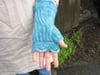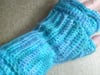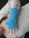 The Half Moon Mitts are crocheted sideways in back loop sc for a stretchy rib, with a curly edging at wrist and palm.