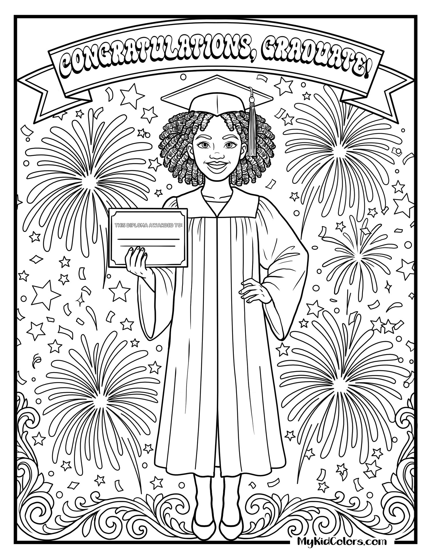 - Page 1 features a classic graduation cap and diploma surrounded by stars and confetti, making it a simple and joyful starting point for younger kids to color and celebrate achievement