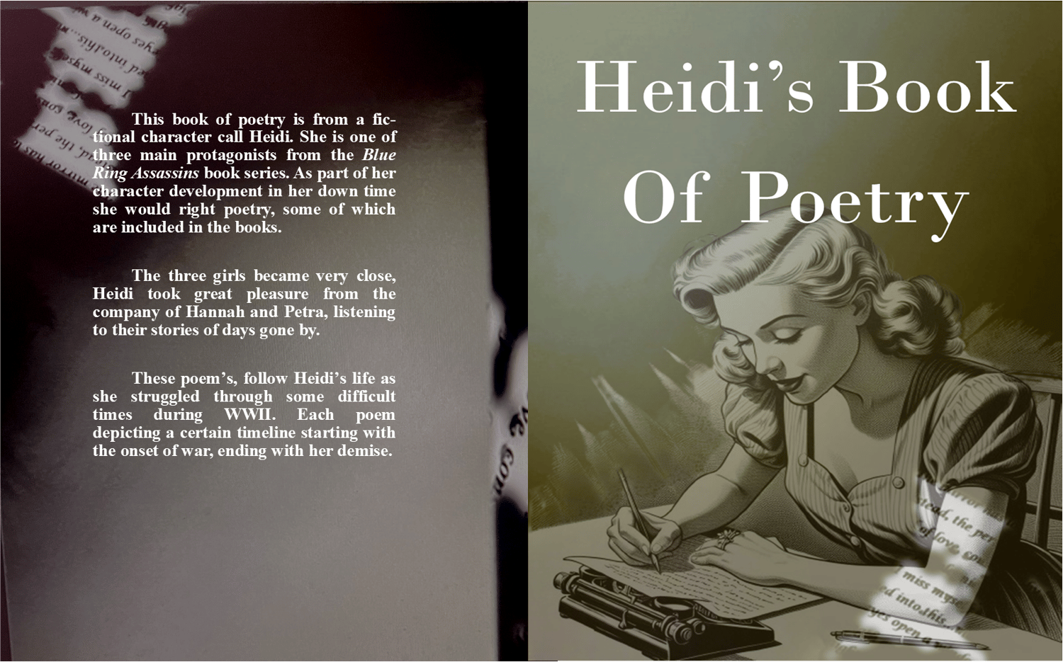 This book of poetry is from a fictional character call Heidi. She is one of three main protagonists from the Blue Ring Assassins book series. As part of her character development in her down time she would right poetry, some of which are included in the books.