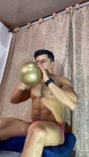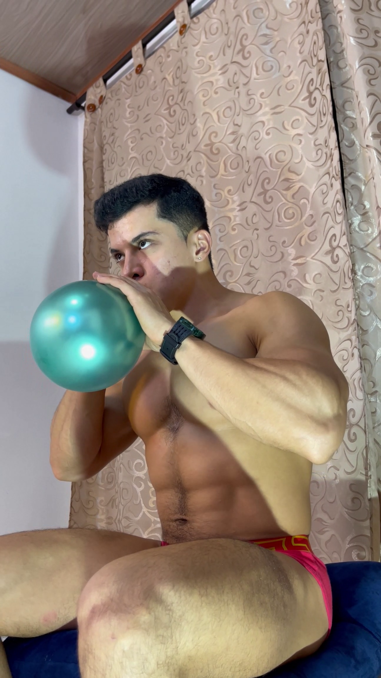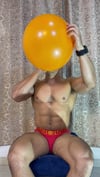 New Muscle God Valerio plays with several balloons. He blows them up one by one and then pops them by sitting on them. This video runs for over 11 minutes.