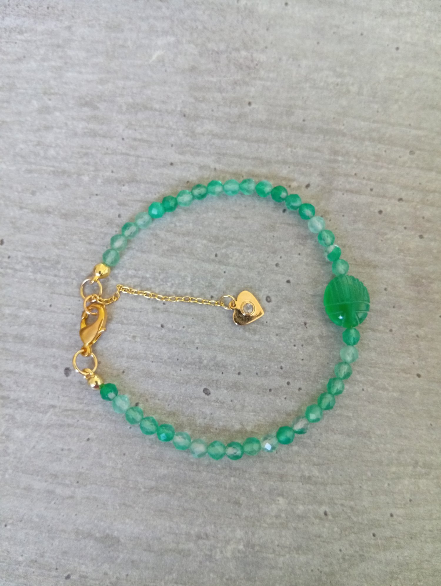 Bracelet en onyx vert facetté, orné d’un scarabée en onyx assorti. Une pièce élégante, vibrante, symbole de transformation et de renouveau. Le petit cœur à l’extrémité de la rallonge apporte une touche de douceur au raffinement.