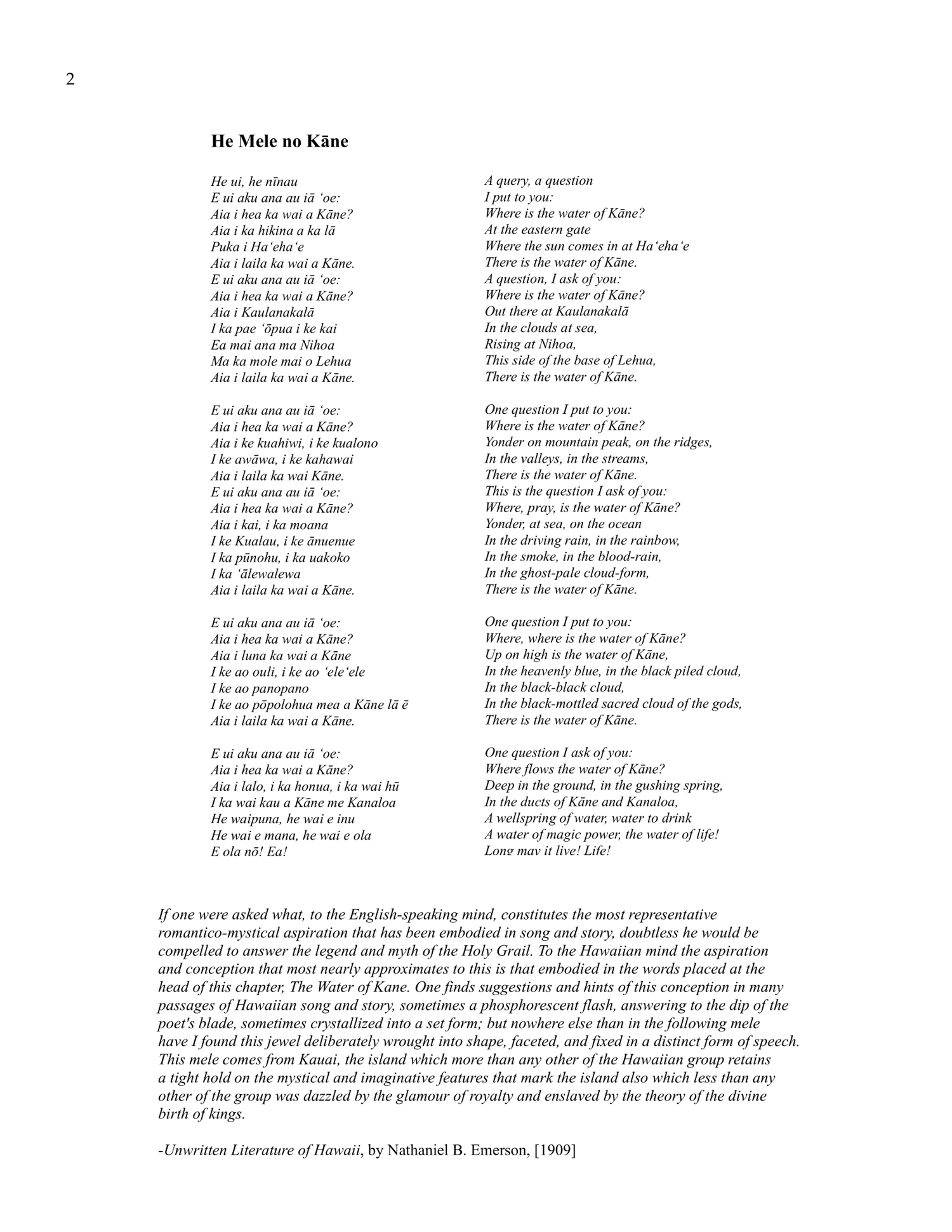 From "Unwritten Literature of Hawaii," by Nathaniel B. Emerson [1909]:If one were asked what, to the English-speaking mind, constitutes the most representative romantico-mystical aspiration that has been embodied in song and story, doubtless he would be compelled to answer the legend and myth of the Holy Grail. To the Hawaiian mind the aspiration and conception that most nearly approximates to this is that embodied in the words placed at the head of this chapter, The Water of Kane. One finds suggestions and hints of this conception in many passages of Hawaiian song and story, sometimes a phosphorescent flash, answering to the dip of the poet's blade, sometimes crystallized into a set form; but nowhere else than in the following mele have I found this jewel deliberately wrought into shape, faceted, and fixed in a distinct form of speech.This mele comes from Kauai, the island which more than any other of the Hawaiian group retains a tight hold on the mystical and imaginative features that mark the island also which less than any other of the group was dazzled by the glamour of royalty and enslaved by the theory of the divine birth of kings.
