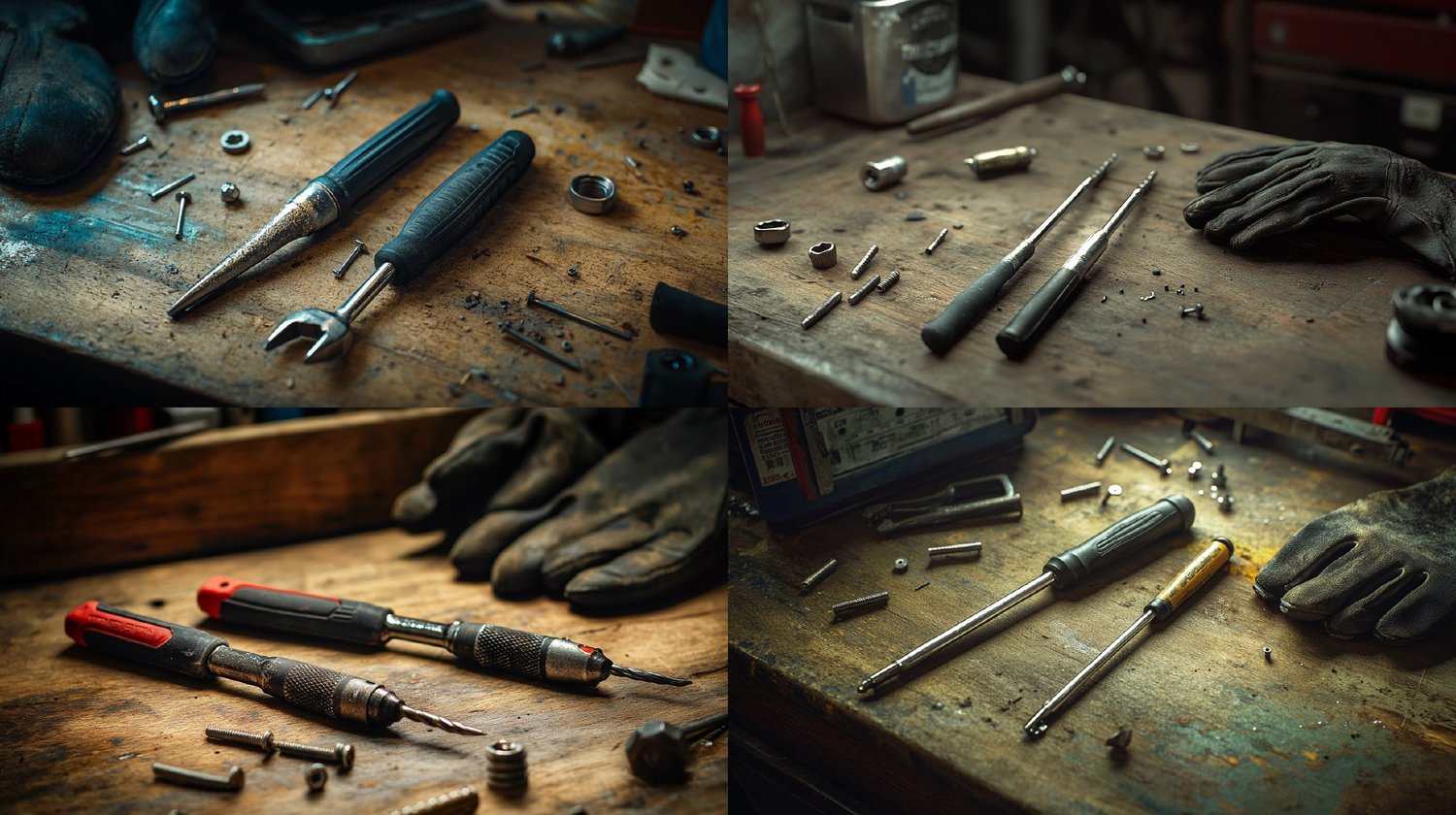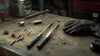 Set in a well-used workshop with oil-stained wood, scattered screws, washers, and a worn glove, this scene delivers deep realism and emotional impact through lighting, texture, and composition.