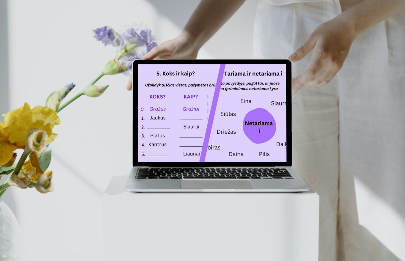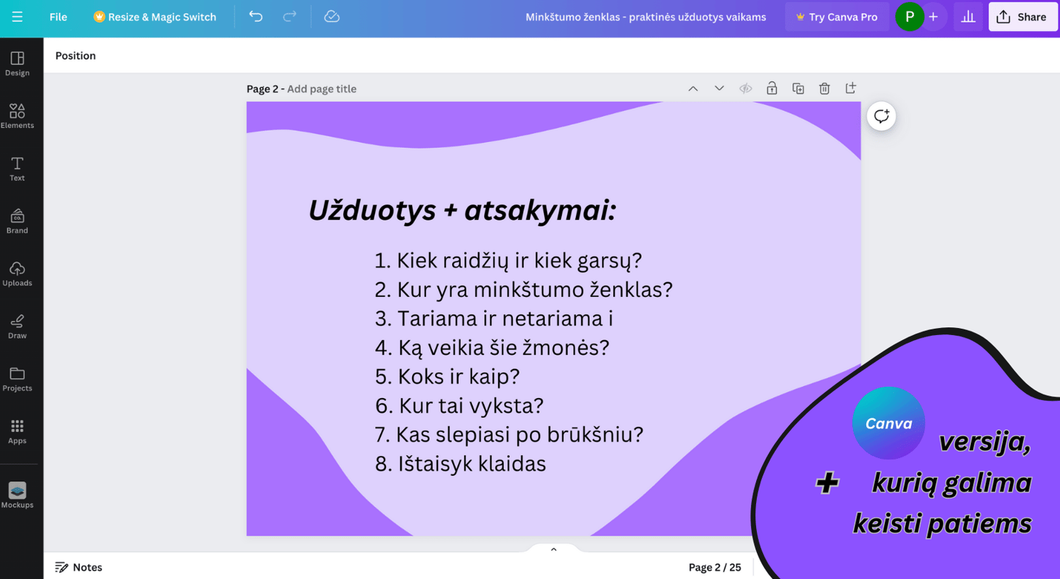 - Užduotys „Canva“ programoje - tai versija, kurią galėsite spręsti per kompiuterį ar telefoną, jei mokate šia programa naudotis. Šios versijos privalumas - nereikės nieko spausdinti ir galėsite patys keisti užduočių išdėliojimą ar pasirinkimo variantus, kad vaikai galėtų kuo ilgiau šias užduotis naudoti.