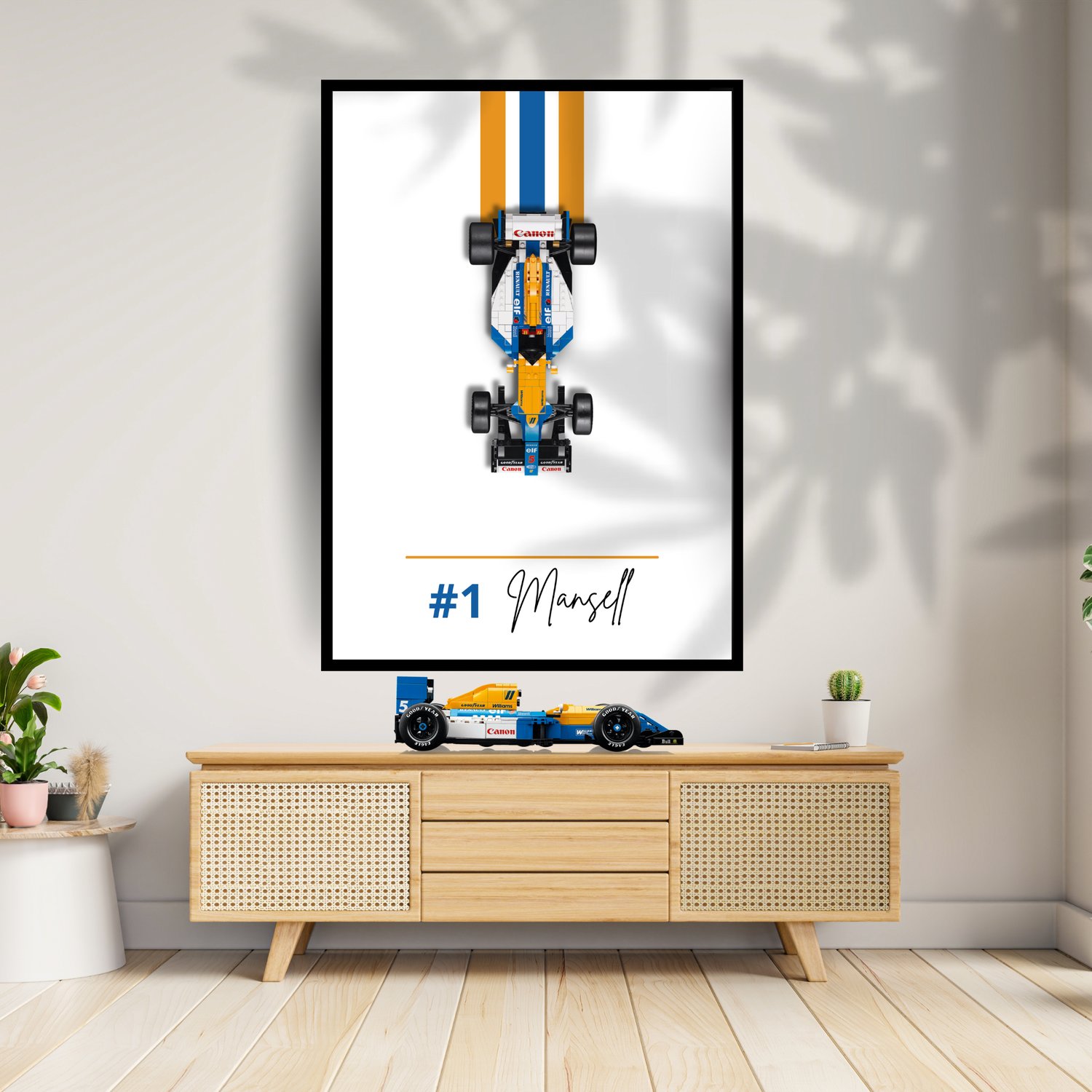 Affiche numérique compatible avec la LEGO Icons Williams FW14B – Nigel Mansell #10353, spécialement conçue pour mettre en valeur cette monoplace mythique dans un cadre élégant, moderne et premium.