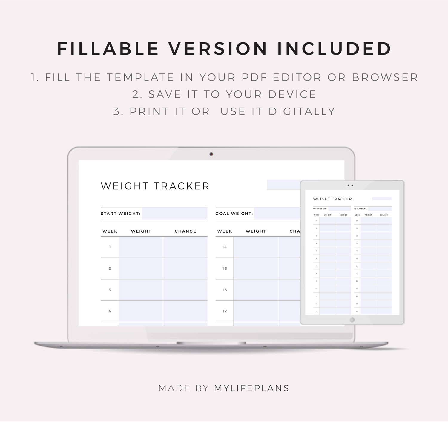 26 Week Weight Tracker, Printable & Fillable Template, A4/Letter Size