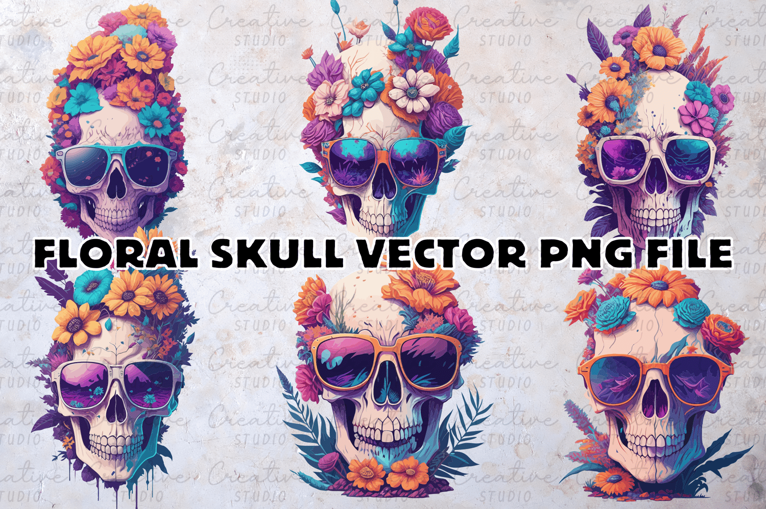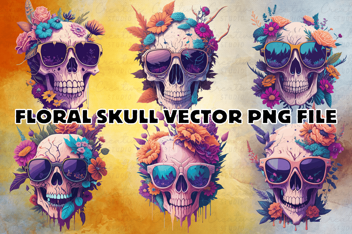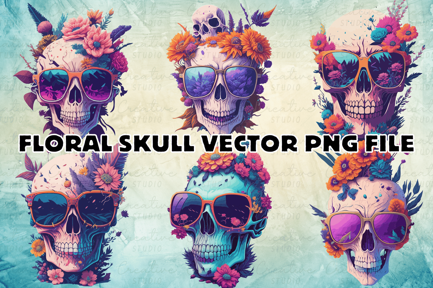 Vintage Skull with Sunglasses and Flowers Design Sticker Clipart Sublimation
