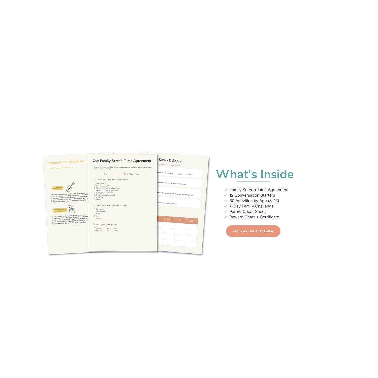 - Family Screen-Time Agreement — A contract everyone signs. Screen-free times, screen-free zones, agreed consequences, and exceptions. Parents commit too —