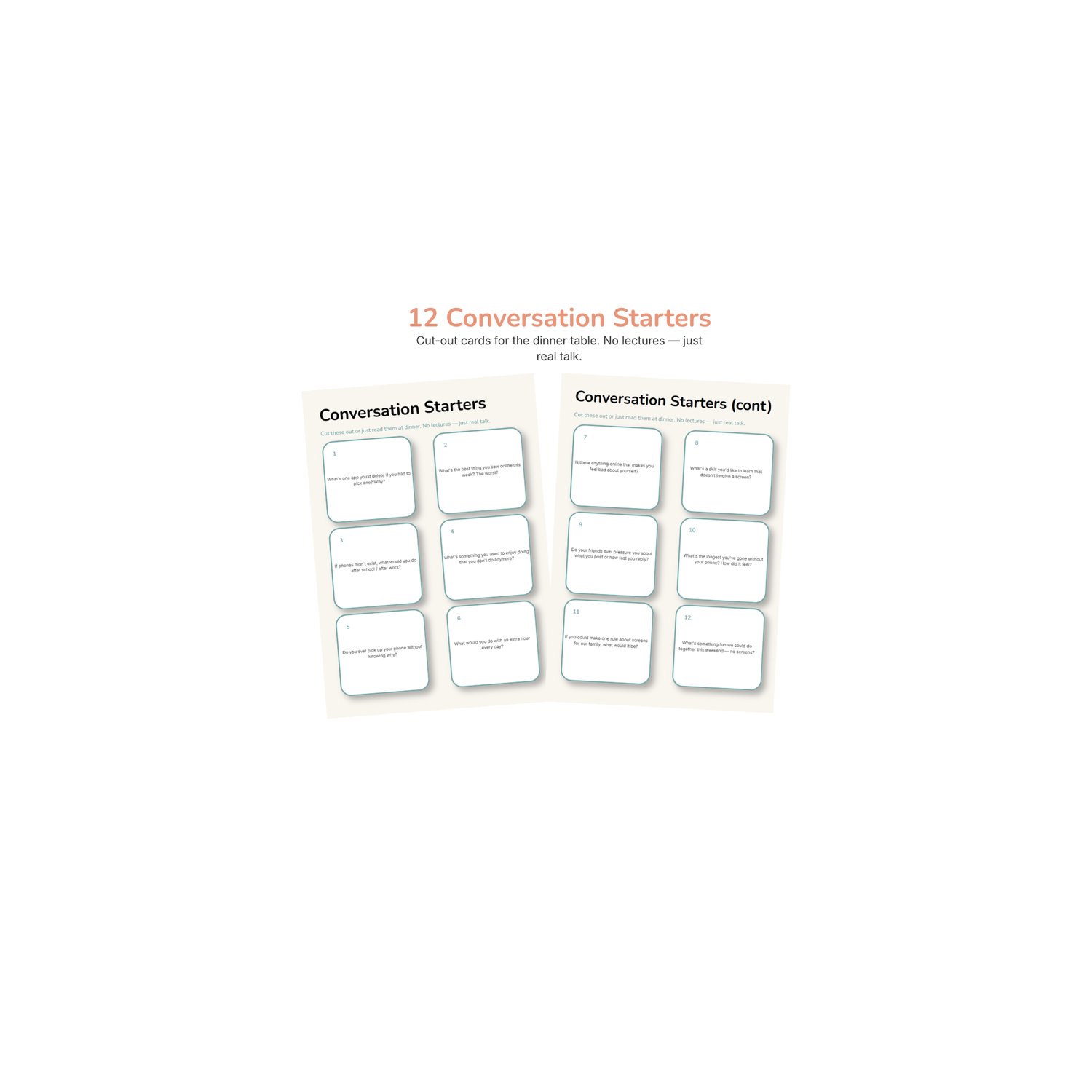 - 12 Conversation Starters — Card-style prompts for the dinner table. Questions like "What's one app you'd delete if you had to?" and "Do you ever pick up