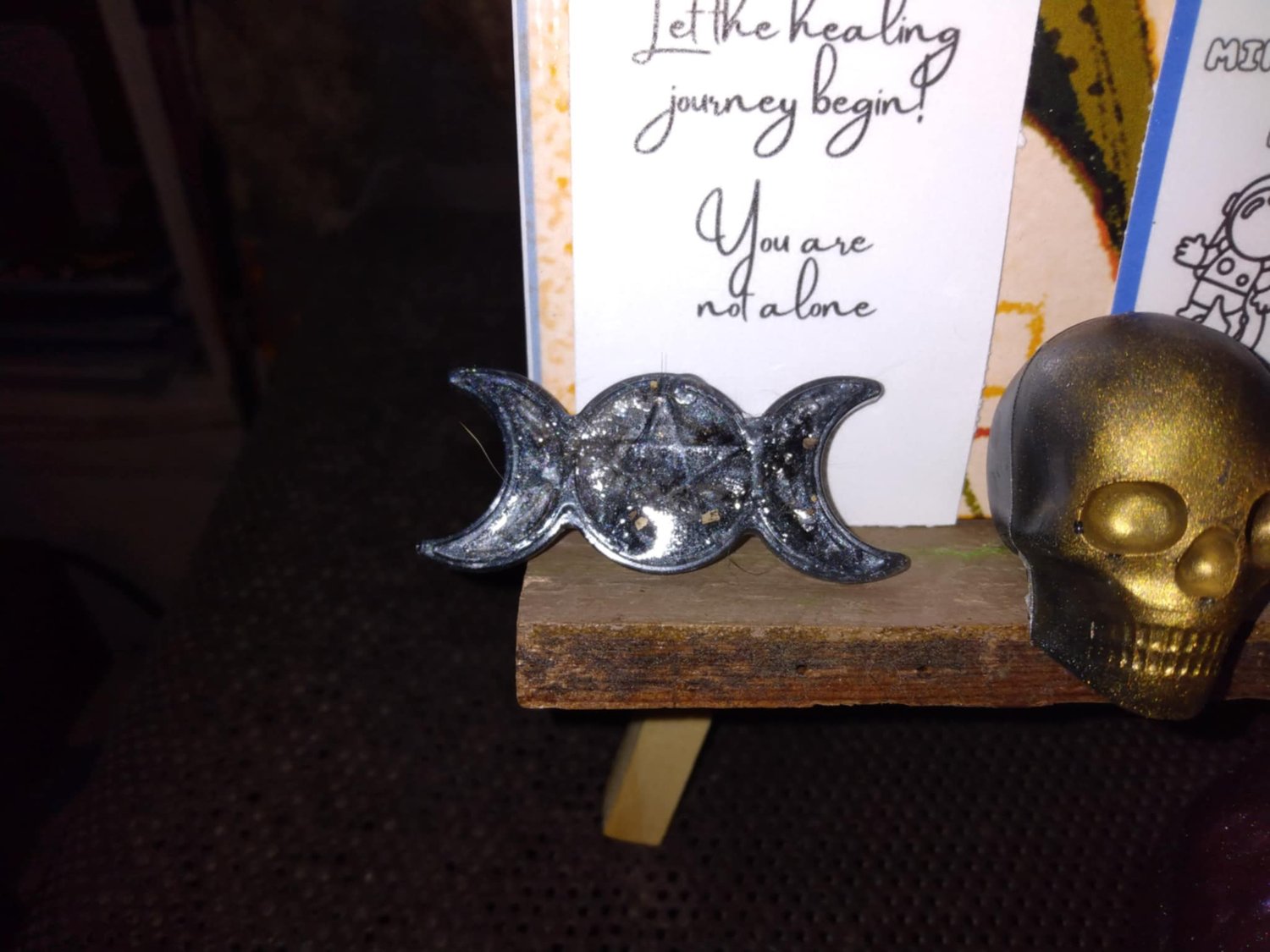 Calling Hecate shelf decor represents Amaris' love of crescent moons. Hecate's Roman counterpart is Trivia.