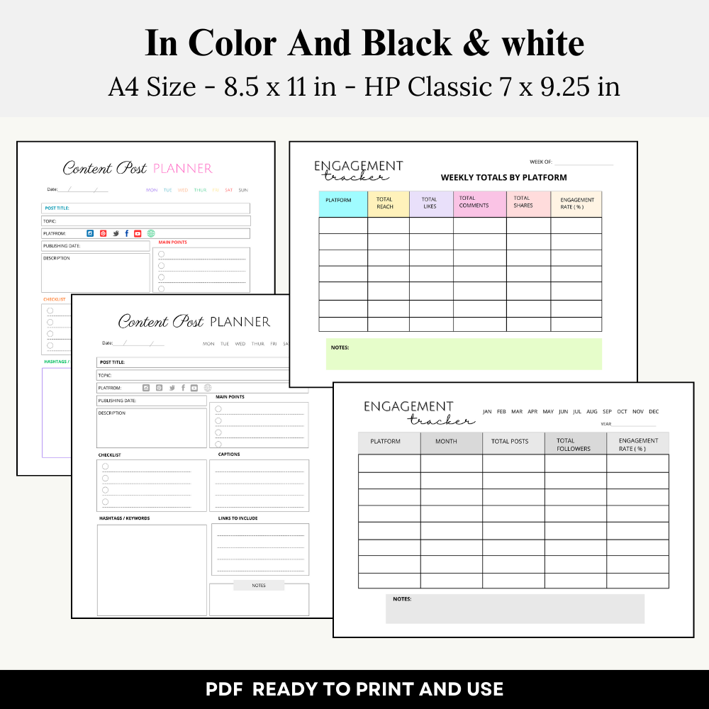 Printable Social Media Content Post Planners, Engagement Trackers.