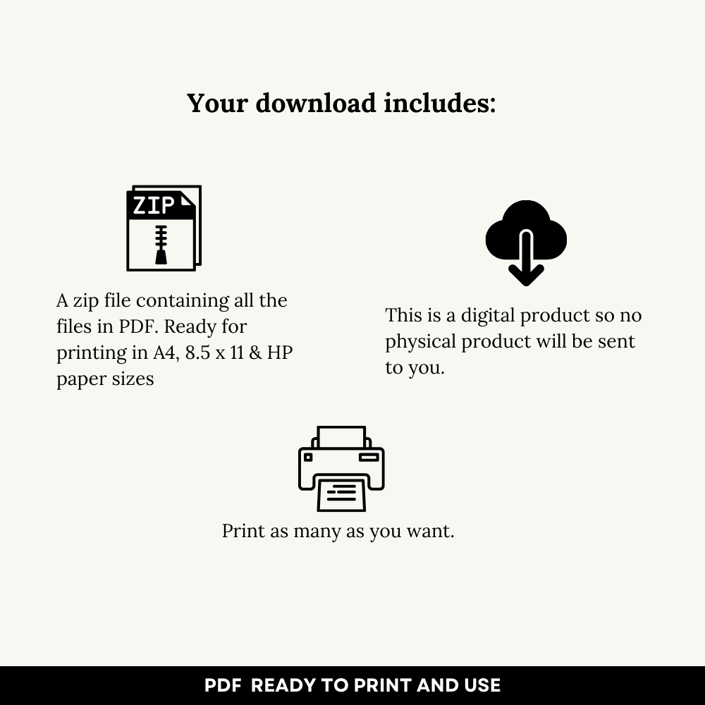NB: It's a digital product, PDF ( A4, 8.5 X 11 in, HP) paper sizes. Simply download and print.