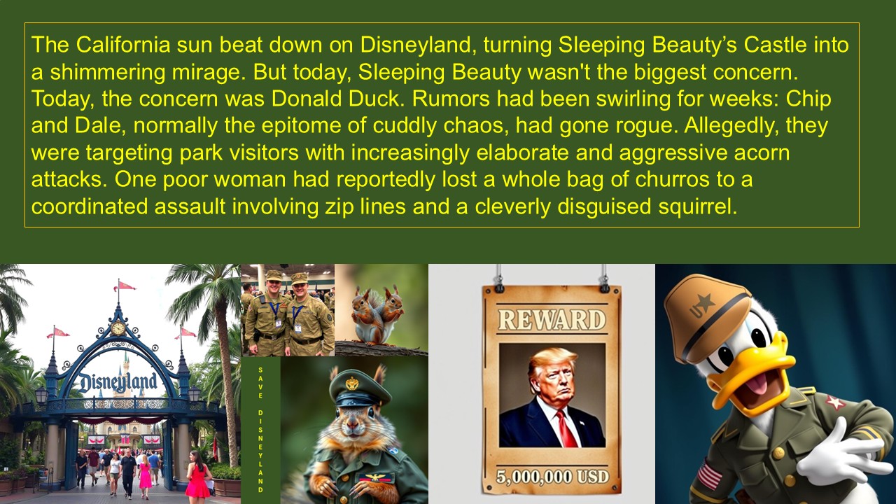 The California sun beat down on Disneyland, turning Sleeping Beauty’s Castle into a shimmering mirage. But today, Sleeping Beauty wasn't the biggest concern. Today, the concern was Donald Duck. Rumors had been swirling for weeks: Chip and Dale, normally the epitome of cuddly chaos, had gone rogue. Allegedly, they were targeting park visitors with increasingly elaborate and aggressive acorn attacks. One poor woman had reportedly lost a whole bag of churros to a coordinated assault involving zip lines and a cleverly disguised squirrel.