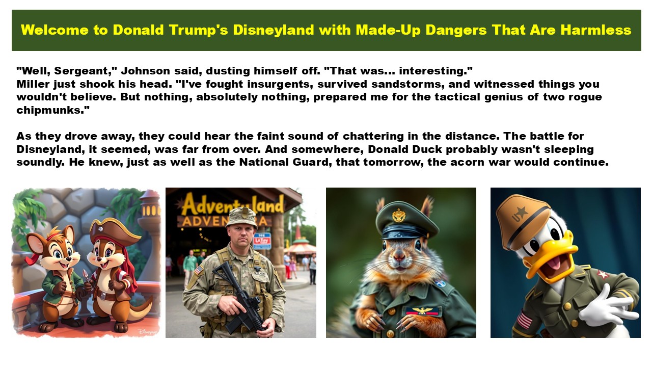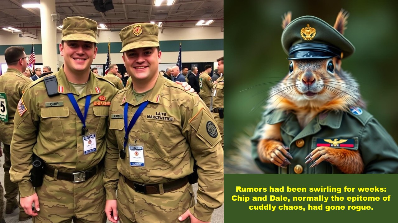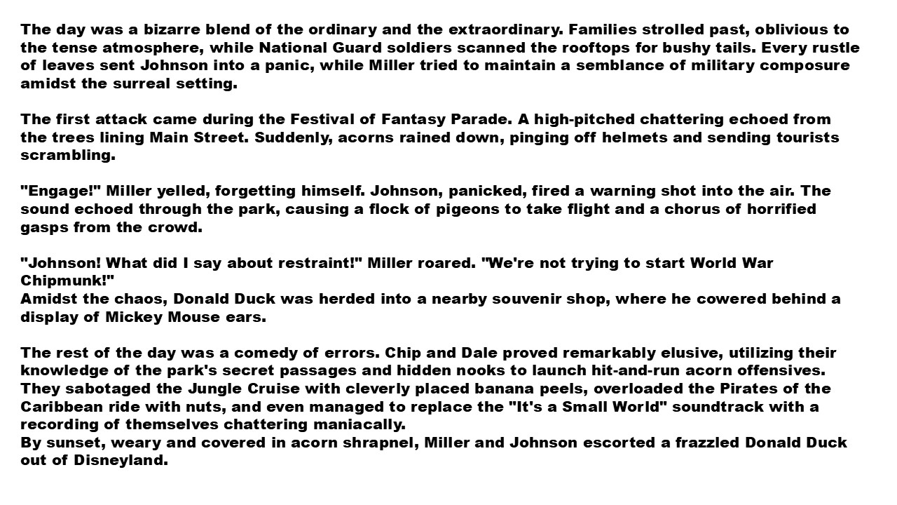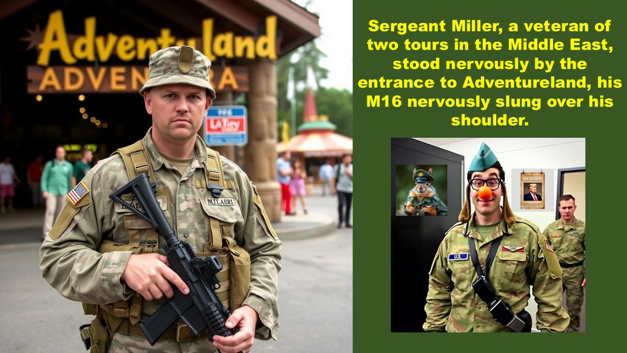 Sergeant Miller, a veteran of two tours in the Middle East, stood nervously by the entrance to Adventureland, his M16 nervously slung over his shoulder. Beside him, Private Johnson adjusted his helmet, his eyes wide with a mixture of excitement and bewilderment. "So, Sergeant," he whispered. "We're... protecting Donald Duck from chipmunks?“