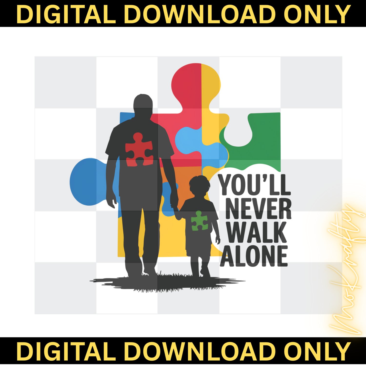 Celebrate the unbreakable bond of family and advocacy with this powerful "You'll Never Walk Alone" digital design. Featuring a silhouette of a father and son walking hand-in-hand against a vibrant, multi-colored puzzle piece backdrop, this PNG is perfect for creating meaningful apparel for dads, grandpas, and supporters.