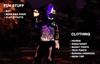 He has Audiolink tattoos, an Audiolink melting bead necklace, kandi jewelry, barbed wire, and pumpkin vine tail, pumpkin stem horn, clothing options, outter ribcage, a bat, a bean bag chair with different blankets, and clap effects.