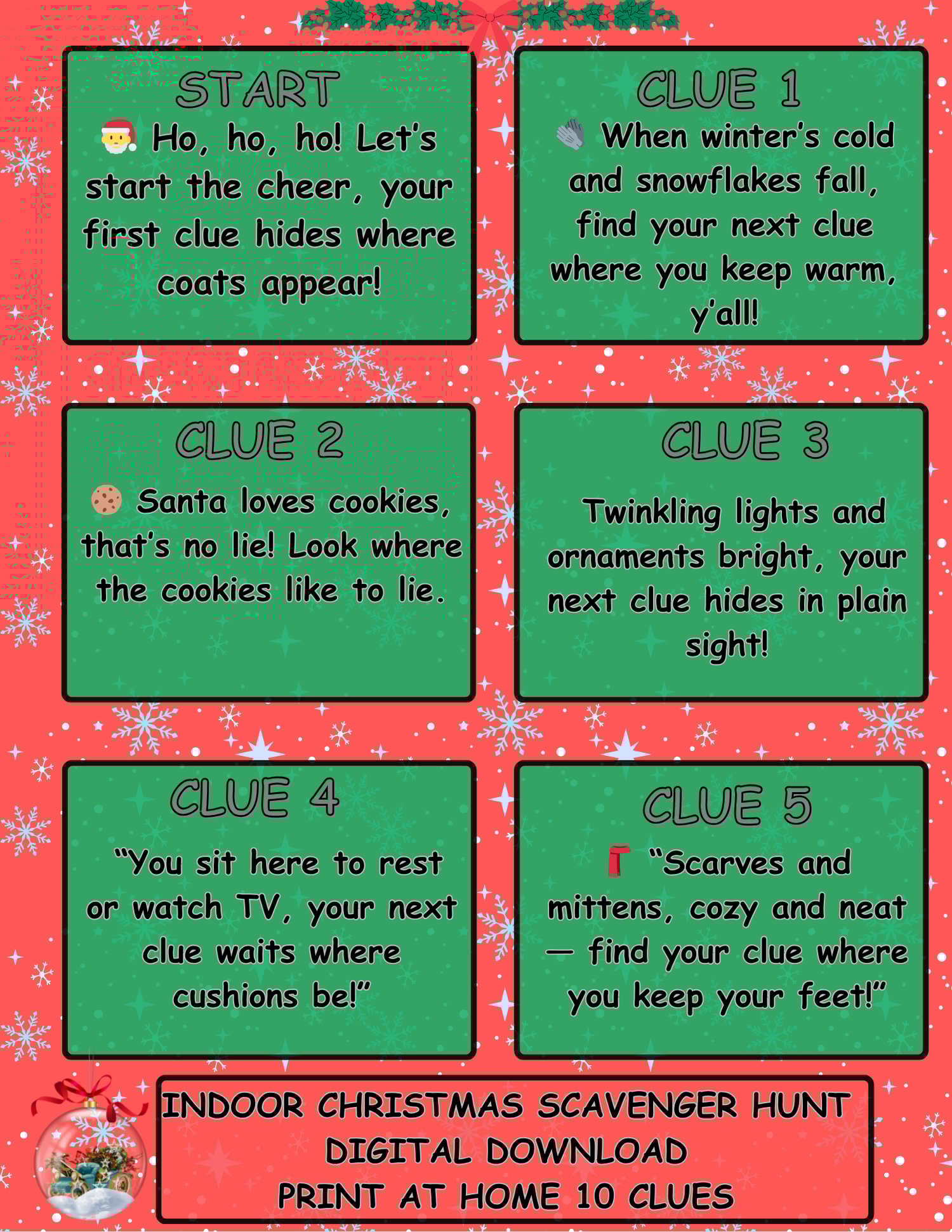 5️⃣ The final clue leads to a “Christmas Treasure” — candy canes, small gifts, or a surprise box! 🎁