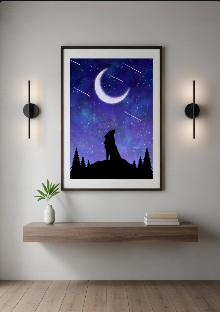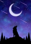Watching The Stars Fall portrays a quiet, contemplative moment in nature, where the silhouette of a lone wolf stands beneath a glowing crescent moon and a sky alive with drifting stars. The deep blues and purples of the night create a calm, almost magical atmosphere, while the falling streaks of light suggest time passing and wishes being carried across the sky. The wolf’s upward gaze feels reflective rather than lonely, as if it is pausing to admire the vast beauty above, inviting the viewer to share in that same stillness and wonder.