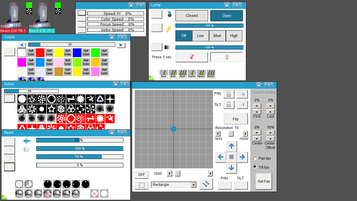 * Verifique, con el Fixture de pruebas de 20CH (click), que coincidan estos canales: 3 Dimmer, 2 Strobo / Shutter, 1 en el valor 35 = Color Verde, 4 en el valor 68 = Gobo de la tercer foto, 9 foco (mover el 9 hasta que se vea bien la figura).