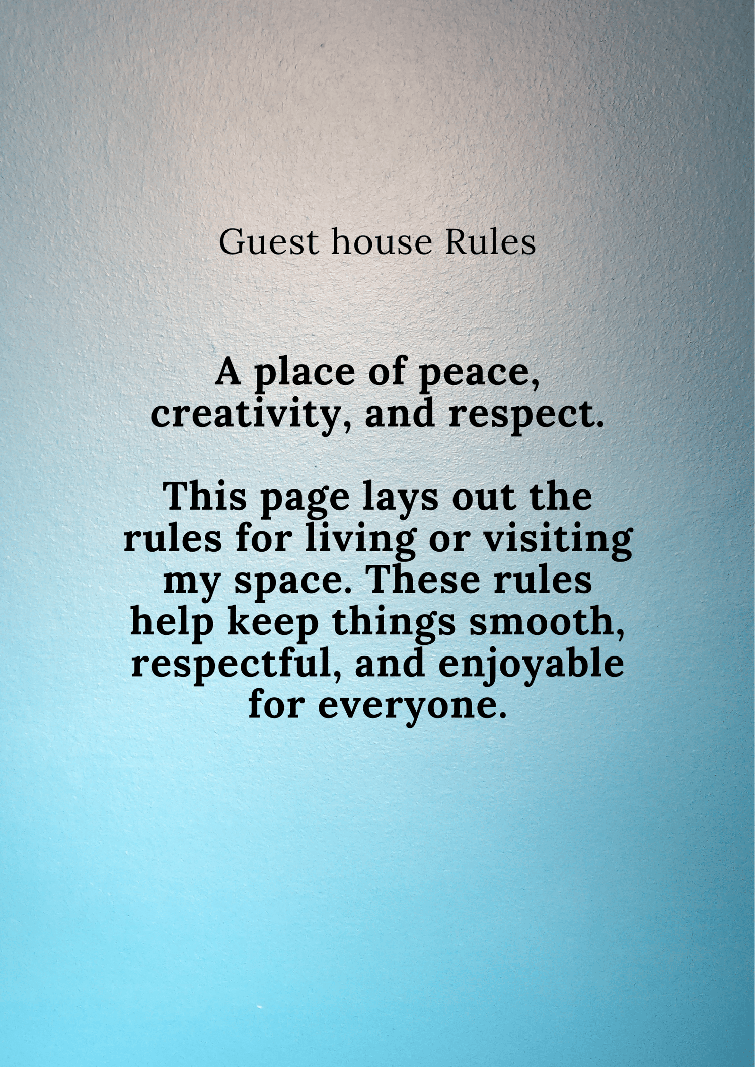 Welcome to ........ Space—a home designed for peace, creativity, and mutual respect. These house rules ensure a clean, organized, and drama-free environment where everyone feels comfortable. Whether you’re a guest, roommate, or visitor, following these rules keeps the energy positive and the space running smoothly.